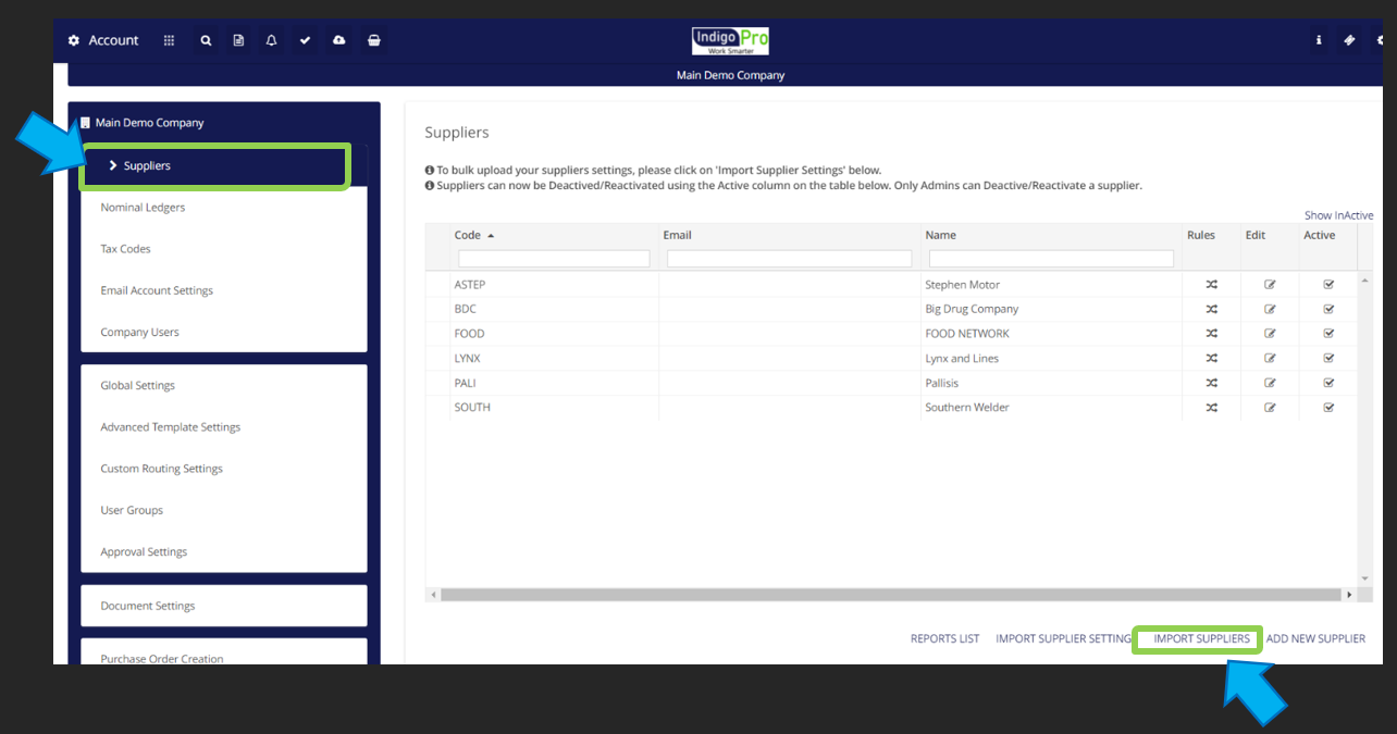 From there click "Suppliers" on the left, and then "Import Suppliers" on the bottom of the window