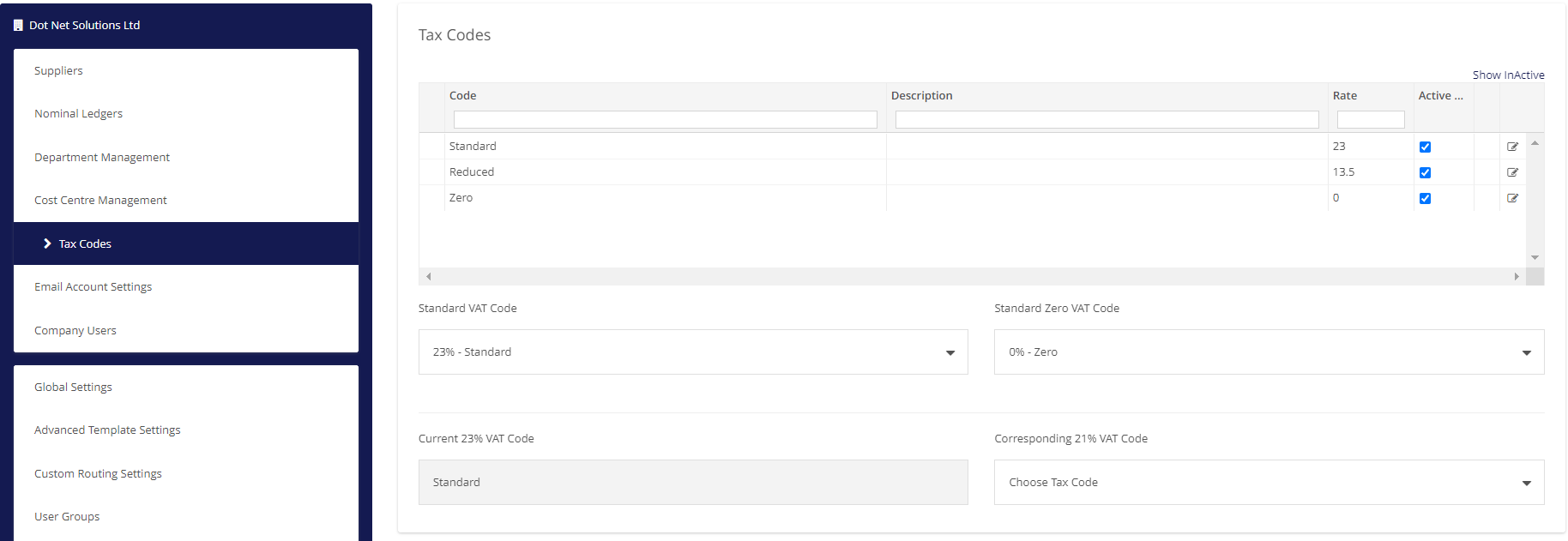 To get started, click "Tax Codes" from the left hand side of the company settings screen, and you'll be greeted with the following page: