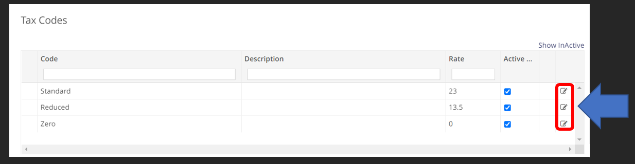 The tax codes in the screenshot above are the there by default, so you may need to just change the Code and the Description to match what you have for those tax codes in Intact; by clicking the icon on the right hand side of the tax code you want to change.