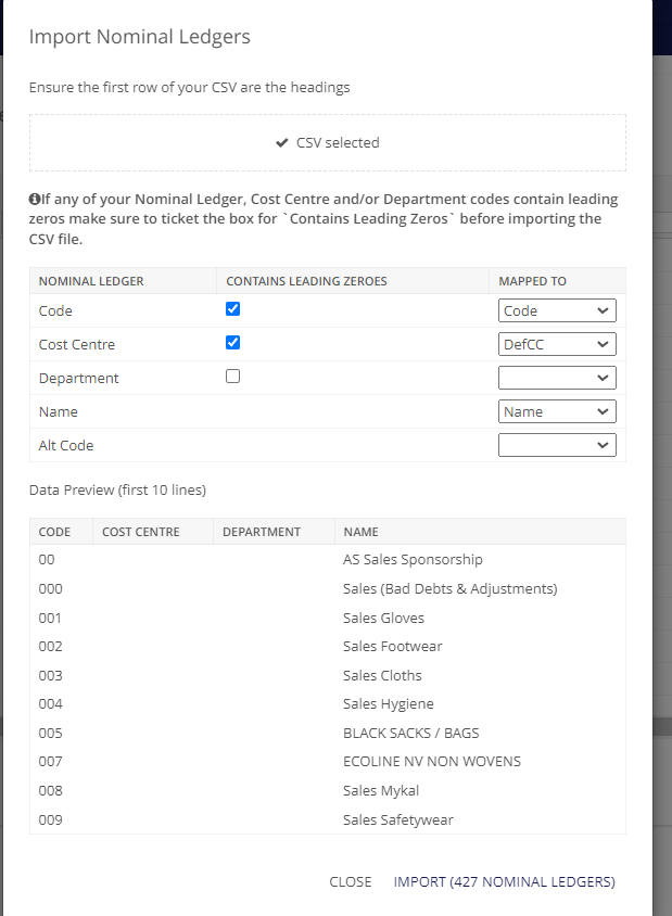 From the Nominal Ledgers screen, select "Import Nominal Ledgers" from the bottom of the window. after importing your CSV file, and mapping some of the fields to your headers, Indigo Pro will display a preview of the first 10 items in your CSV file to show you how how they'll be formatted in Indigo Pro,