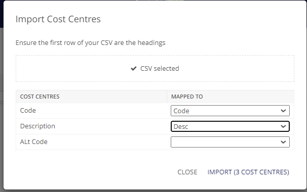 Click "Import Cost Centers", select the CSV file to upload, and map your fields as normal, it will display how many cost centres will be imported at the bottom of the box when you go to confirm.