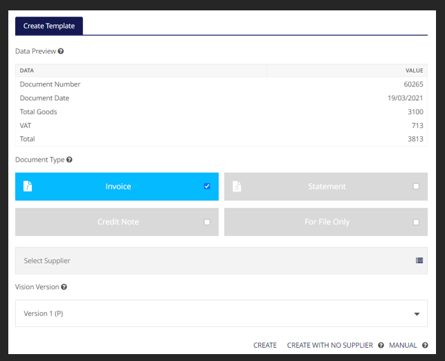 You can also choose to setup the template without a supplier attached, and select the supplier at a later date by clicking "Create with no supplier" from the bottom of the page, matched documents will go into the Alerts folder until a supplier has been selected.