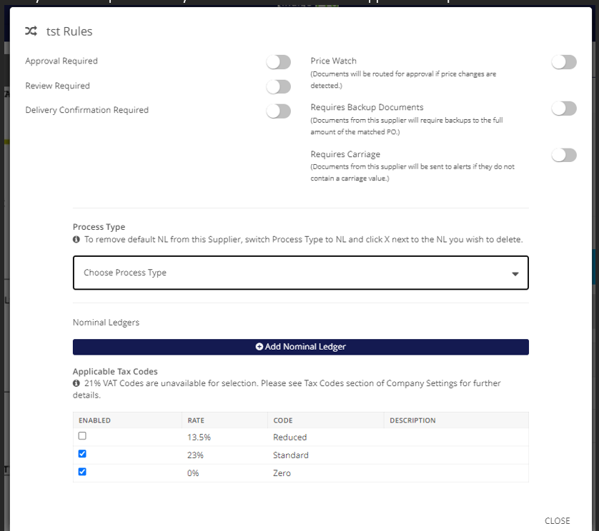 From here you can select the Process Type (whether this supplier is processed via PO numbers, or through nominal ledgers. And select any VAT Codes that apply to this supplier. After setting up the supplier rules, just click "close" and select "create" from the bottom of the page.